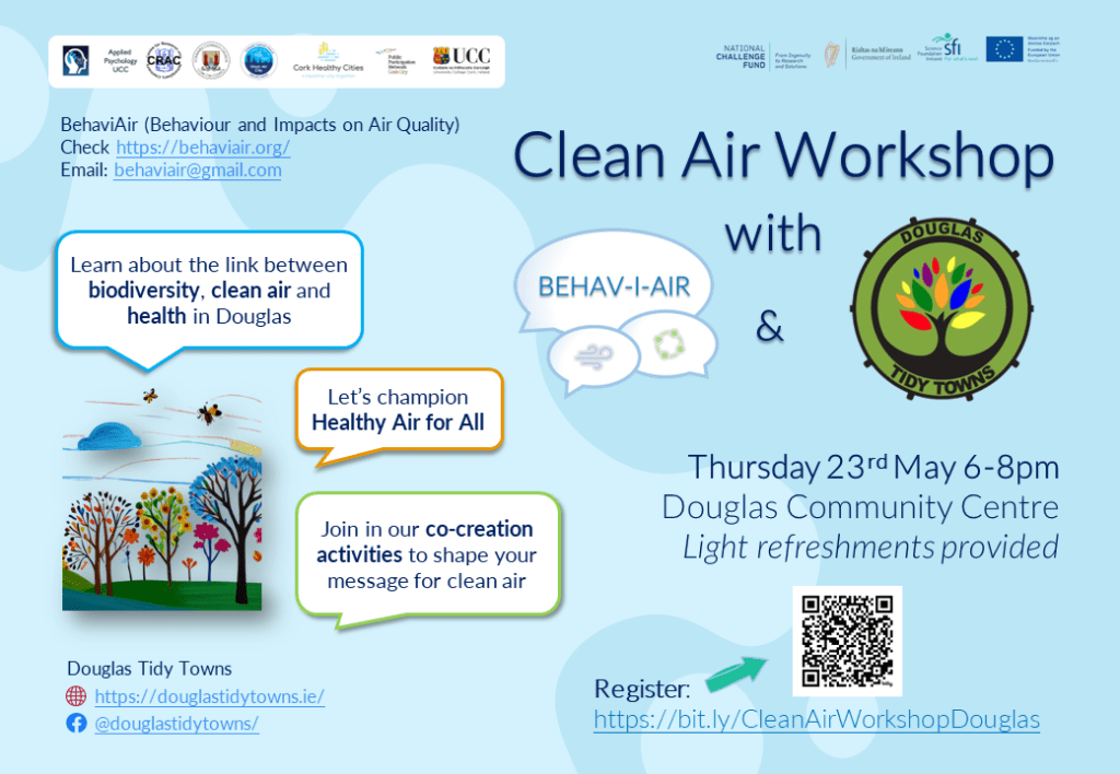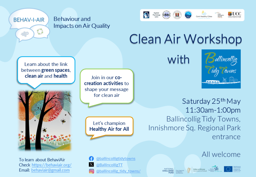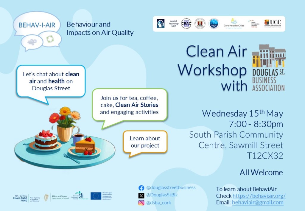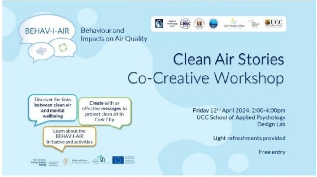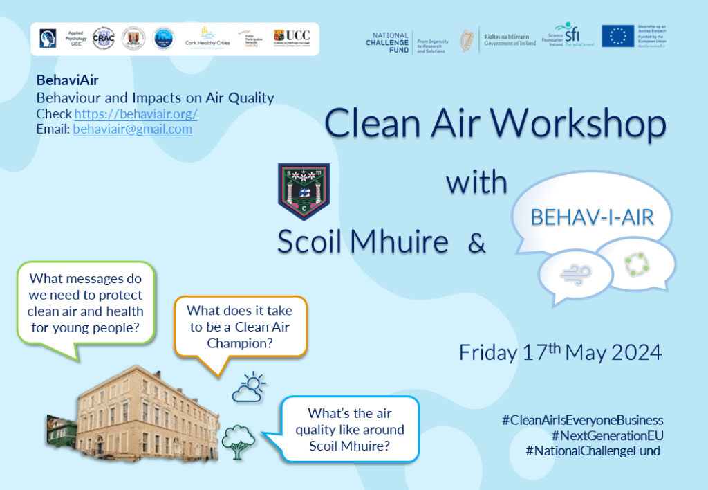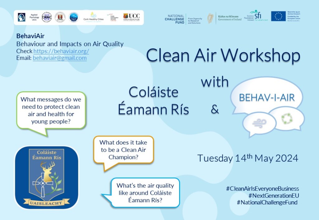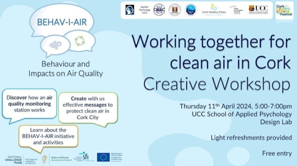 In January 2024, the BehaviAir team contributed in an advisory role to Cork City Council’s first ever Clean Air Night on the 24th January 2024, to encourage members of the community to take steps to promote clean air nights without dirty air in Cork. We supported this work with a social media communication campaign (see on Twitter/X)