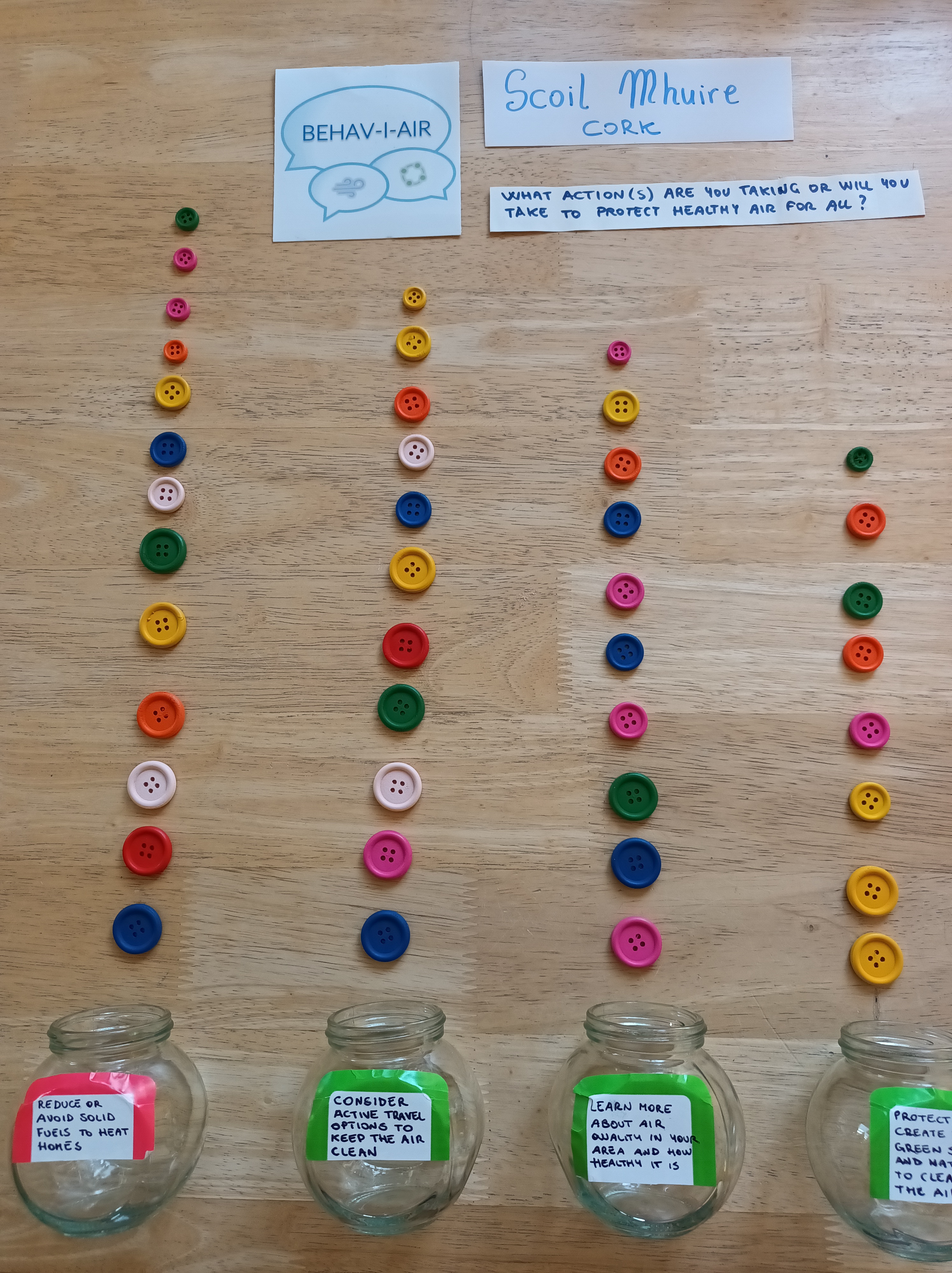 Brilliant ideas and enthusiasm from students of Coláiste Éamann Rís. Discussions surrounding reducing solid fuel use, opting for more active travel options and learning about air quality and health. A very proactive group of students in Scoil Mhuire who were passionate about breathing safely when travelling to school voted for reduction of solid fuels and active travel to school.