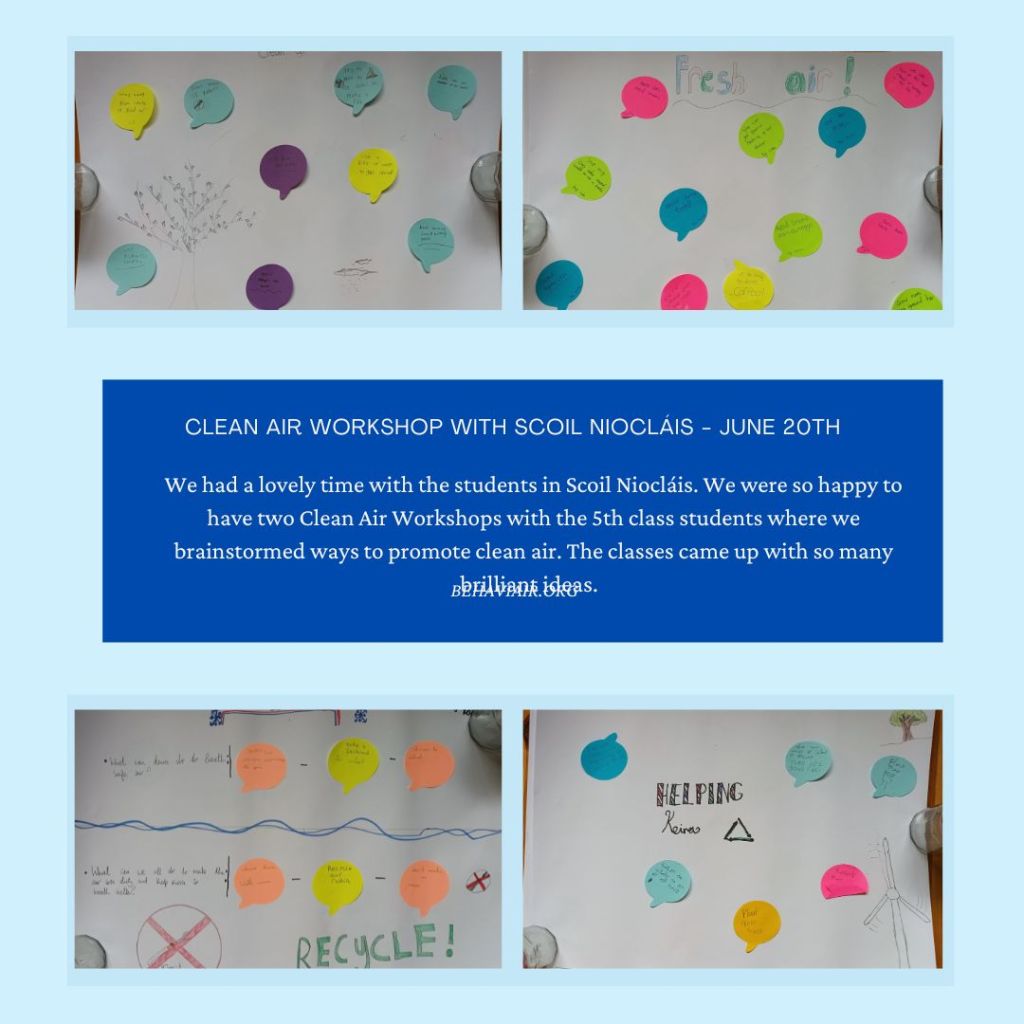 We had brilliant fun in Scoil Niocláis in Grange discussing clean air strategies and learning about what we can do as a community to encourage everyone to be more conscious about air pollution especially for the more vulnerable people in our society. The students all got involved in brainstorming ideas for better clean air.