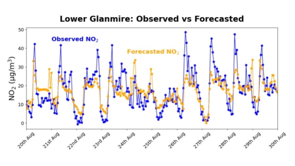 Our first step is to test this approach using air quality data from various air quality monitoring sites around Cork city. So far, results are encouraging — we get good levels of agreement between predictions and observations for both NO2 and PM2.5 at several sites around the city. Predicted levels of these pollutants follow the same daily and weekly trends as we see in measurements from air quality monitoring stations in the city, giving us confidence that the approach is useful.